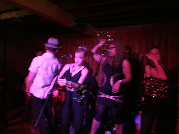 A group of young adults dancing and enjoying themselves on a stage during a live band performance.