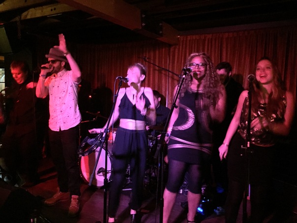 A man wearing a hat and white patterned button down shirt sings into a mic while three women sing into microphone stands beside him and a man drums behind him.