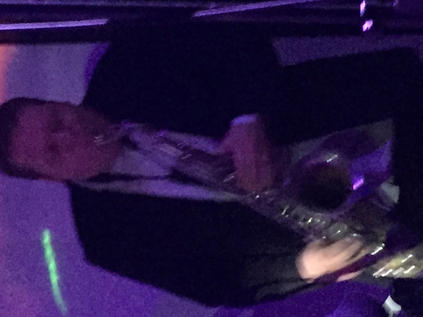 This is a very blurry picture of a guy playing the saxophone.