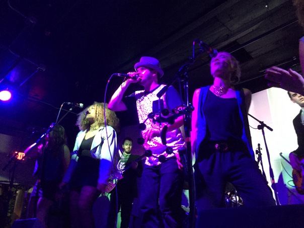 A group of performers are on stage singing while a video/photographs display on a wall behind them in a dark venue.