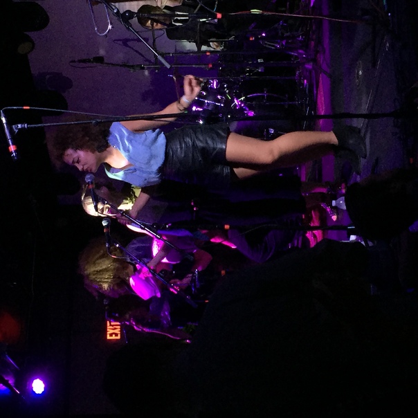 A lady with curly hair, and wearing a leather skirt, sings at a microphone surrounded by her band under purple lighting.
