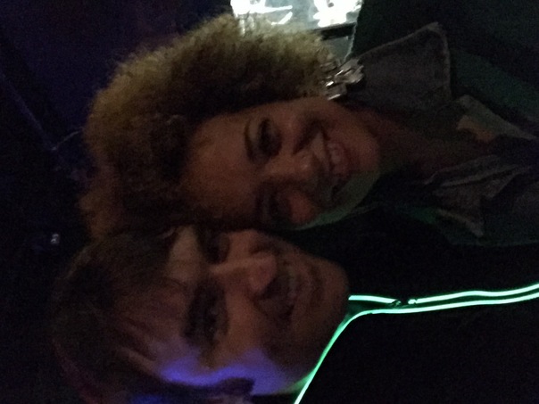 White man with colored girl with an afro smiling in a poorly lit room with neon on his black clothing.
