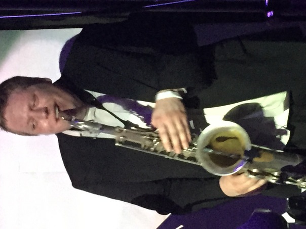 This photo shows a middle aged man in a suit playing a saxiphone.