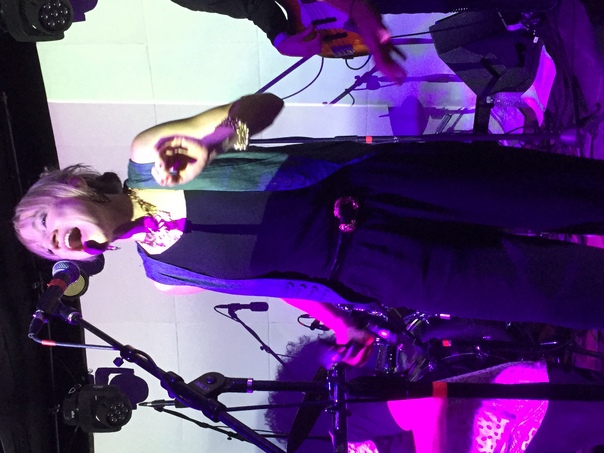 Blonde woman singing on stage with purple lighting.