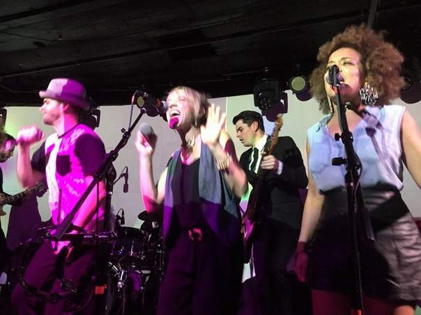 A small concert group featuring at least two female singers, a drummer, a male singer, and two male guitarists.