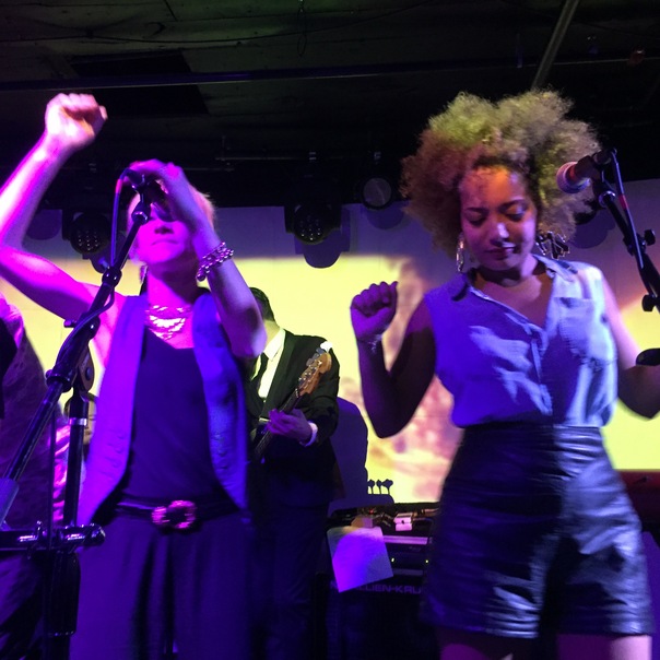 Two women dancing on a stage for a performance at night.