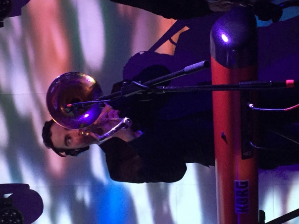 A man is playing a trombone illuminated by purple light in front of a red Korg keyboard