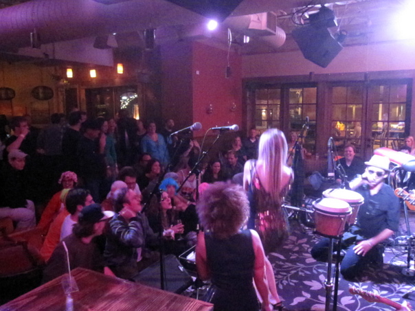 A concert is going on here.Some girls are performing and some artists are playing drums |