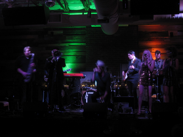 There are men and women playing musical instruments and singing on stage. |