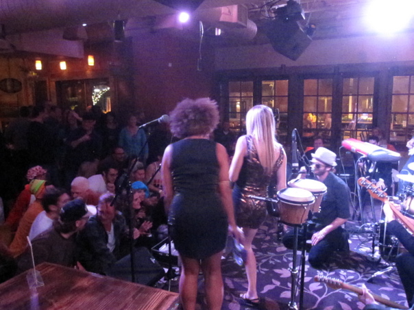 In a dimly lit bar or lounge filled with adults, 2 females sing along with a band. |