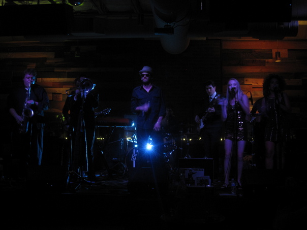 The band members are all wearing dark clothing while standing on a stage. |