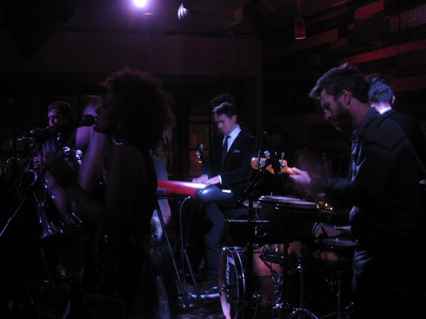 Women with bushy hair singing over the mic while other musicians playing their instruments. |
