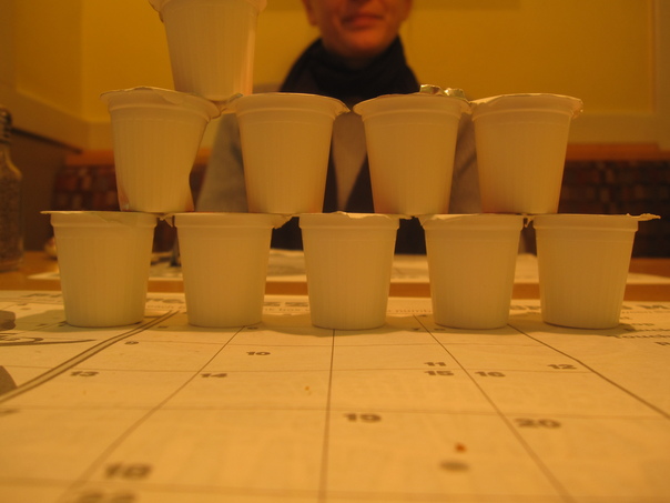 White cups are stacked atop each other on a calendar on a brown table.