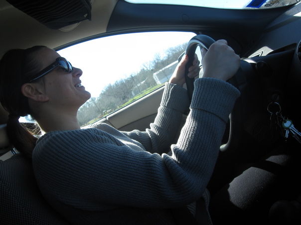 a girl driving a car by laughing that she can also drive the car .