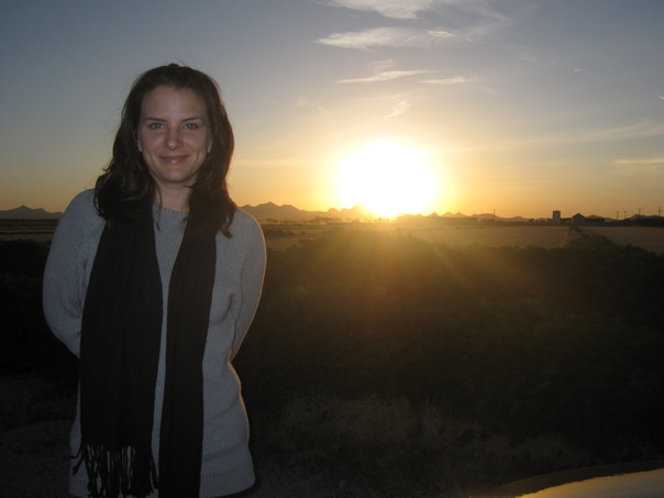 A picture of a woman standing in front of a bright sunset.