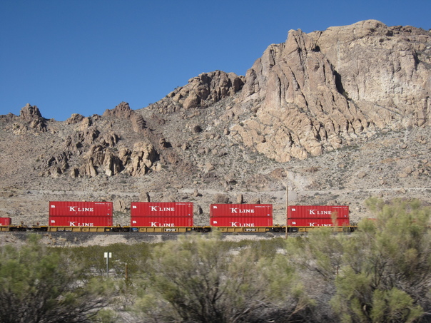 View of a runnin goods train transporting wagons near a hill side area.