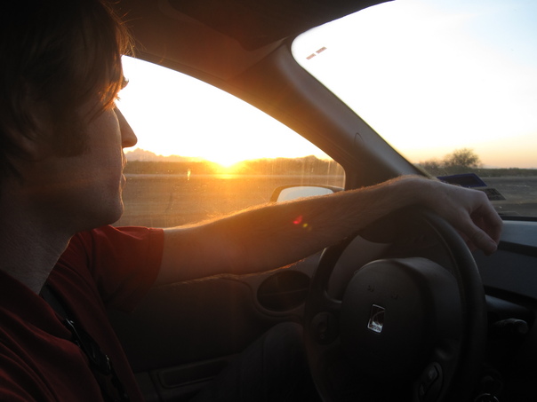 A man in a red short-sleeved shirt drives as the setting sun glows through the car's window.