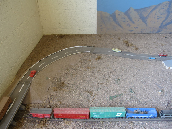 it is a photo of a toy car moving on the bridge and toy train is moving on the railway track