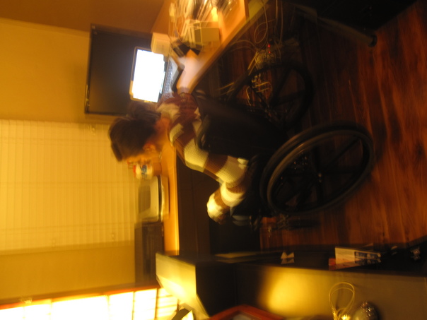 A SICK PERSON SITTING IN WHEEL CHAIR HAVING HIS EVENING OR MORNING DRINK.