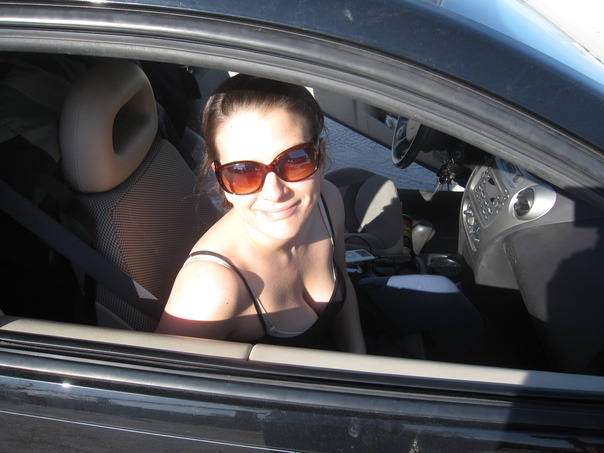 A woman in a black tank top and sunglasses sits in the passenger seat of a car and smiles.
