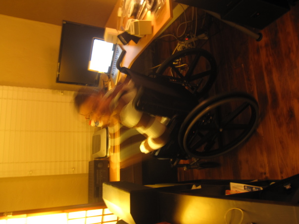 There is a blurry woman in a wheelchair near a laptop computer that's on a desk.