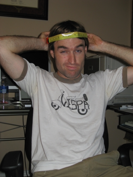 A guy with a vespa shirt on and measuring his forehead with a tape measure.