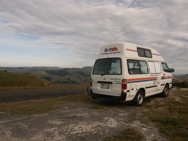 Picture is of a Britz Campervan parked on side of road overlooking hills and valleys.