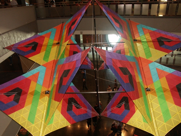 Aerial view of a mall with these gorgeous colorful kites decorated in geometric patterns hanging in the main hub of the floors.