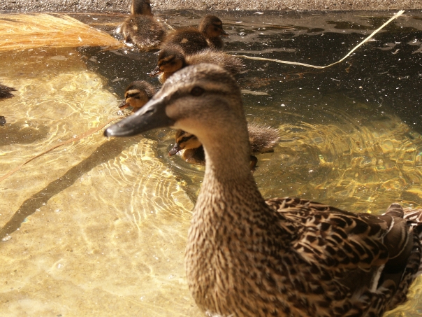 A duck with her five ducklings on a sunny day swimming in the water.