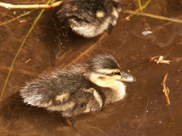 two ducklings in murky water