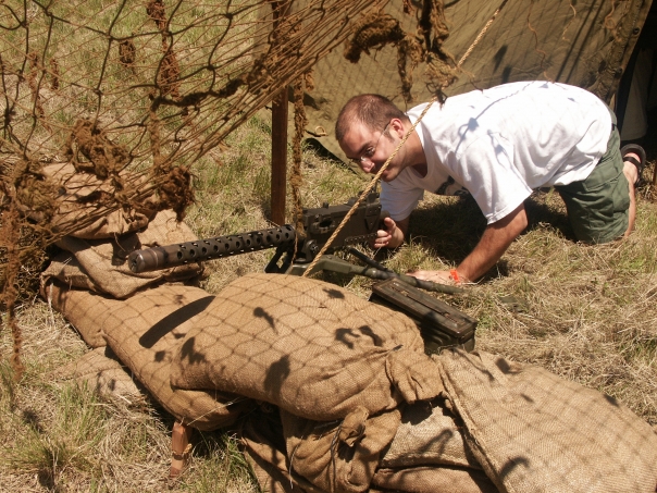 A leisurely dressed man in t-shirt and shorts carefully checks out look barrel black weapon surrounded by tan sandbags.