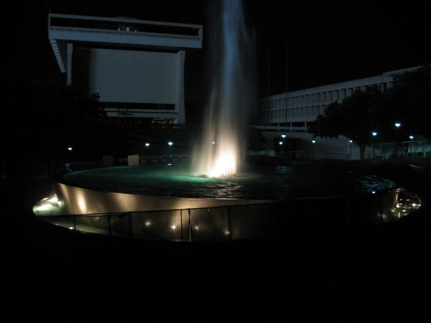 A beautifully lit fountain spurting water at nighttime surrounded by trees and buildings in the far background.