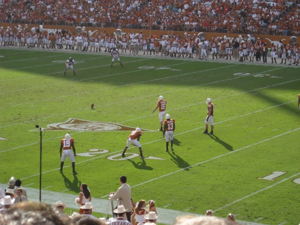 The Texas Longhorns about to kickoff on a bright sunny day.