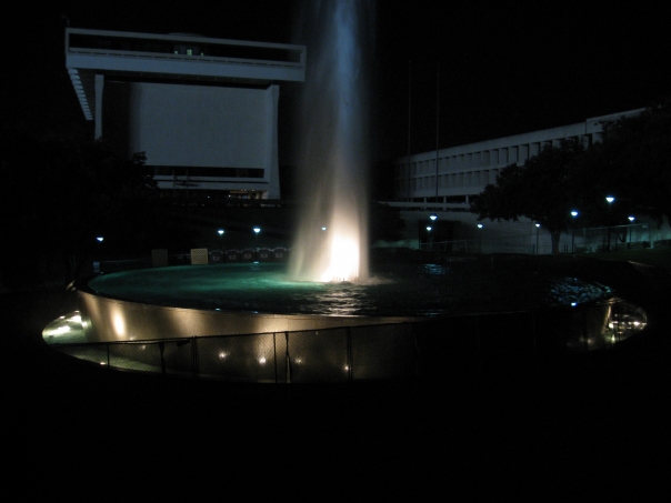 Large ornamental fountain pool with lights shining in the inside of it.