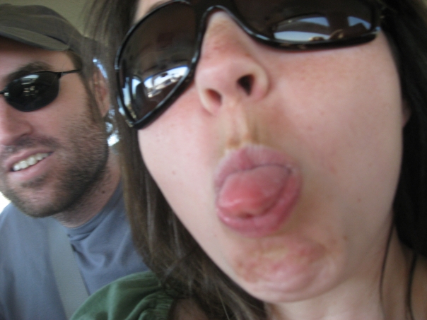 Two people in sunglasses stare into the camera, the girl sticks her tongue out