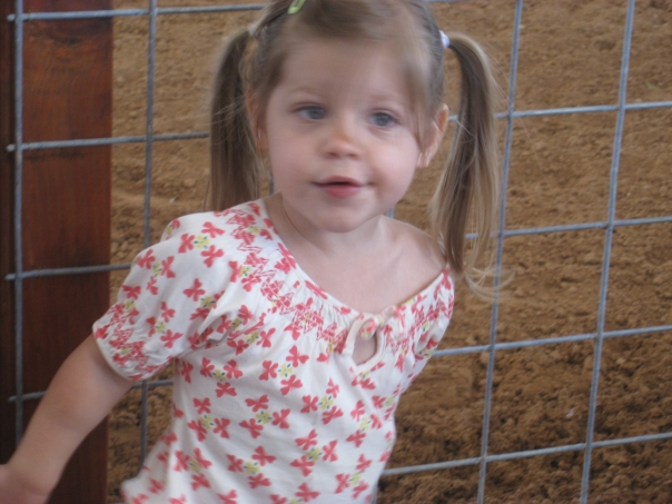 There is a prett blonde hair, blue-eyed girl standing near a corral fence. She is wearing a white shirt with pink butterflies, has pony-tails in her hair.