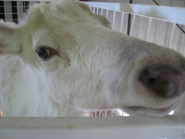 a white animal maybe a horse in a pen looking at the camera