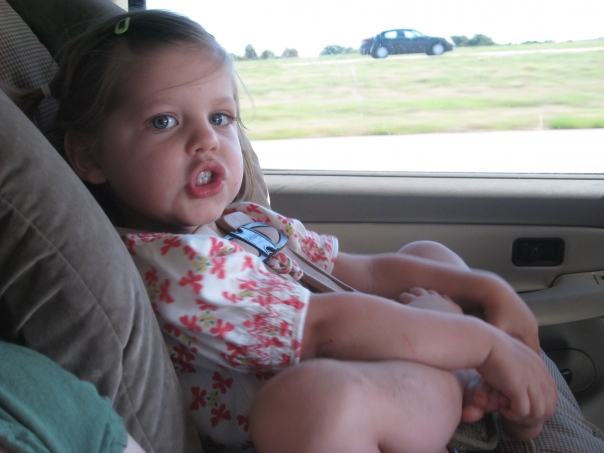 A pink and white floral clad toddler girl makes a puckered face as she rides along in her car seat.