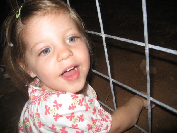 The girl is wearing a top that is white with pink bows and is smiling near the fence.