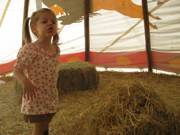 A young girl wearing a red floral patterned dress standing on the straw covered floor of a tent.