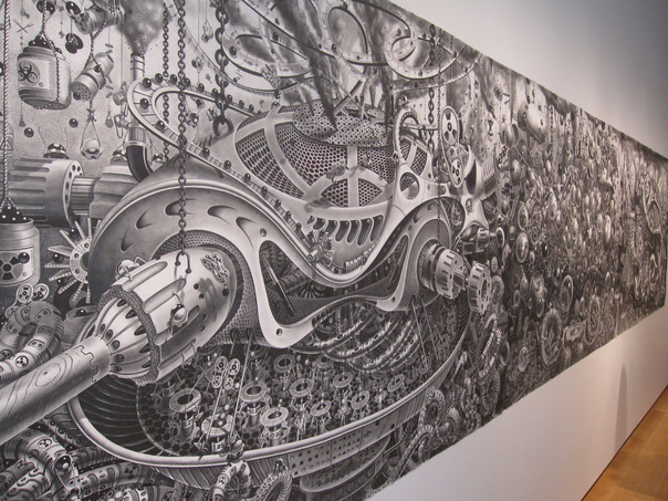 This is a black and white painting of a fictional and elaborate mechanical contraption. |