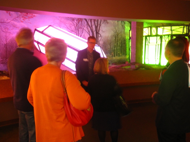 IN THIS PHOTO THE PEOPLE ARE SEEING THE WHAT THE PERSON IS SAYING BY SEEING AT THE PAINTING.