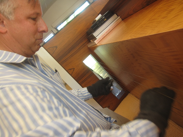 THE WHITE HAIRED MAN IS ENGROSSED IN THE WOOD WORK JOB IN FRONT OF HIM.