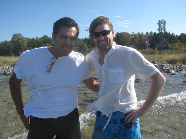 There are two men wearing white shirts while standing by a shallow stream. |