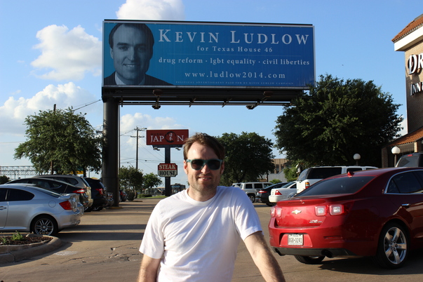 A man in a white t-shirt and sunglasses standing underneath a blue billboard advertising a Kevin Ludlow for the Texas House of Representatives, with a red car in the background.
