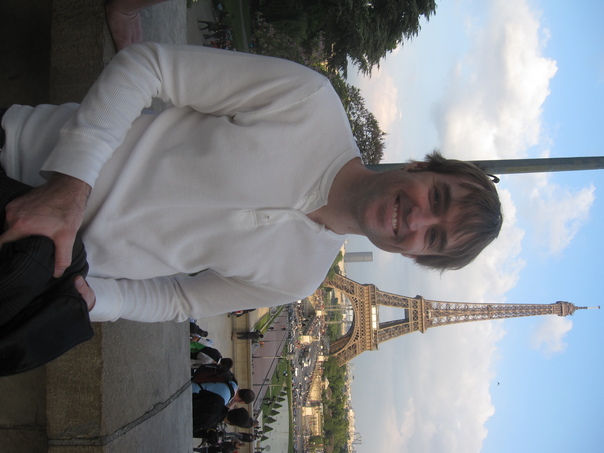 man smiling with eiffel tower in background |