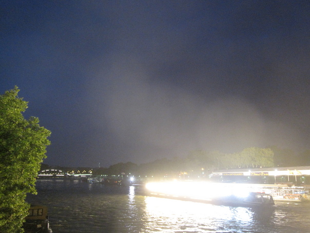 The boats on the river have very bright lights so they do not run into each other. |