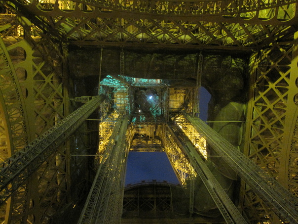 Eiffel tower in Paris, the bottom view that exhibits human’s hard work of zigzag construction. |