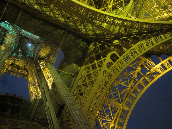 The Eiffel tower looks gold and is interesting to look at from below. |