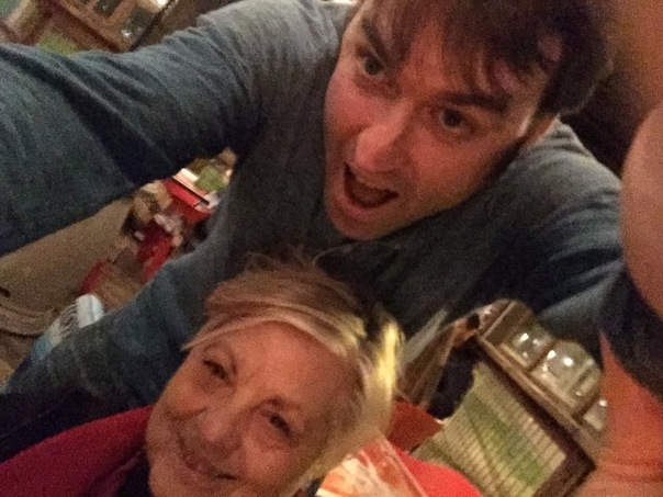 A man is taking a picture of himself and an older woman with his camera.